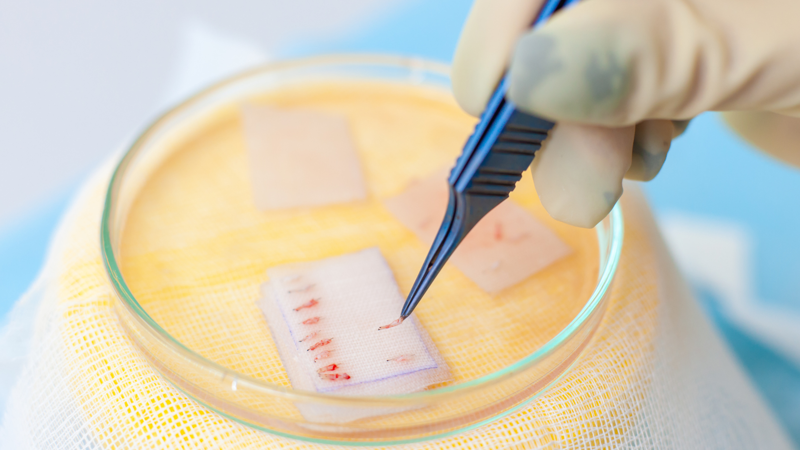 Hårsäckar sorteras och förbereds för transplantation.
